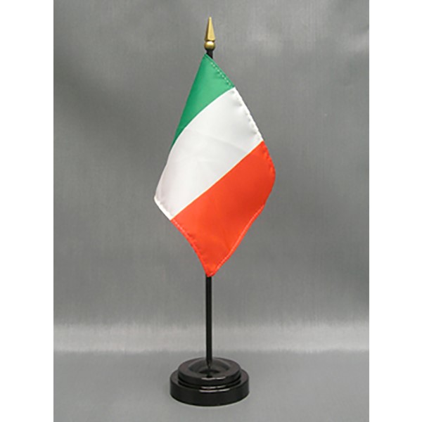This 4x6in Ireland flag is beautifully printed on silk-like material and is hemmed on all four sides. The flag is mounted on a black staff 10in tall with a golden spear at the top. Works great for special events or as decoration on tables or desks.