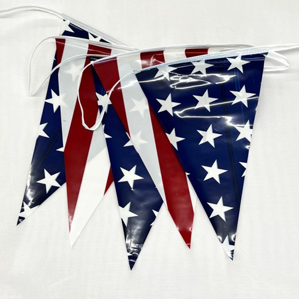 This American Flag String Pennant is 60' in length and each triangle pennant is 12x18". This 4 Mil string pennant is perfect for celebrating or drawing attention to your lot.