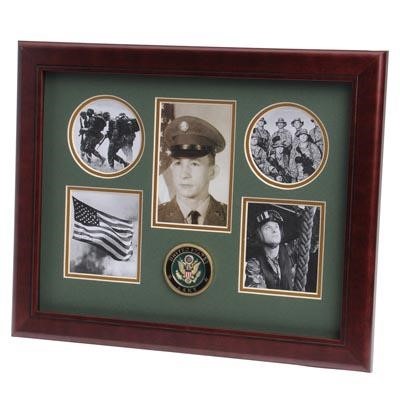 This Army Medallion Collage Frame is designed to hold 5 pictures: one 3-Inch by 5-Inch picture, two circular 3-Inch pictures and two 3.5-Inch by 3.5-Inch pictures. These pictures are set into a double layer of Army Green matting with Gold trim. The frame is made from Mahogany colored wood, and the outside dimensions measure 13-Inches by 16-Inches. A great way to proudly display the pictures of an individual who is serving, or has served in the Army.