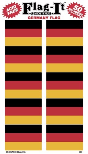 These Germany Flag stickers come 10 stickers per page and are 1x1.5in. Each pack has 5 pages of stickers for a total of 50 stickers. They are printed on high quality paper stock with screen printed inks. Great for classrooms, envelopes, greeting cards, games, rewards, gift wrapping or just about anything you want.
