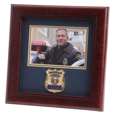 This Police Department Medallion Landscape Picture Frame is designed to hold a single 4-Inch by 6-Inch picture. This picture is set into a double layer of Dark Blue matting with Gold trim. The frame is made from Mahogany colored wood, and the outside dimensions measure 10-Inches by 10-Inches. A great way to proudly display the picture of an individual who is a member of the Police Force.